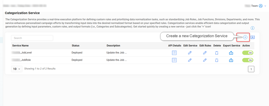 Start by clicking the ‘+’ icon to initiate the creation of a new Categorization Service.