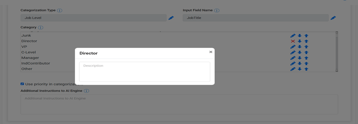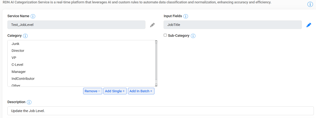 2.3 Category- Specify the category that will be assigned to the input data when it matches the criteria defined in your custom rules. The category represents the main grouping based on the input. For example, Director, VP, Manager, C Level, Other etc.