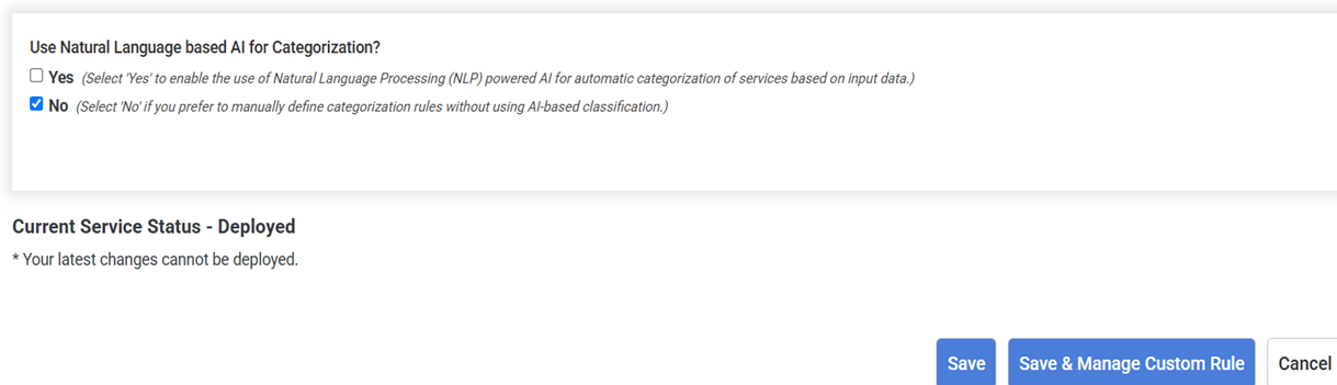 3.1 No– If the user selects the No option, the user can either save the details entered by clicking on the ‘Save’ button or clicking on the ‘Save & Manage Custom Rule’ to define the custom rules for categorization. Please note that at least one Category must be created before you can define any custom rules.