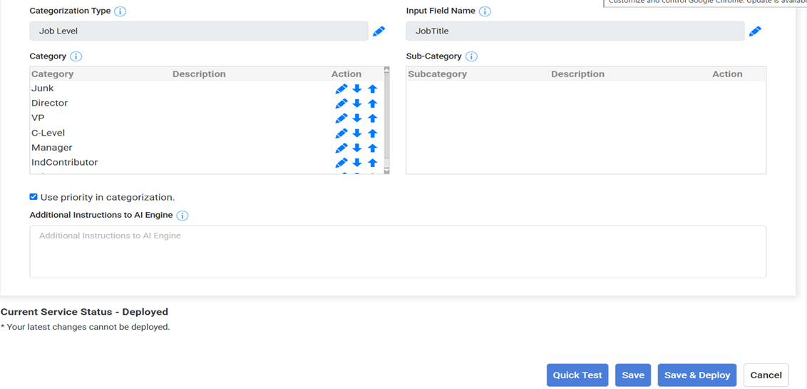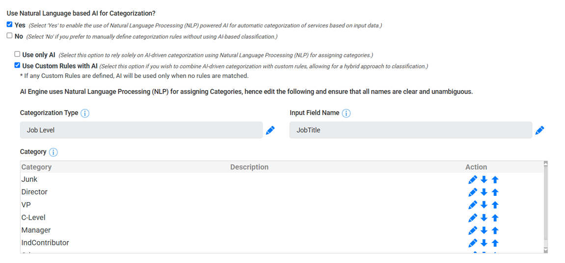 3.2.2.2 Input Field Name – This field will be pre-filled but remains editable. Ensure that the provided input field aligns with the selected categorization type for accurate processing. For example, JobTitle.