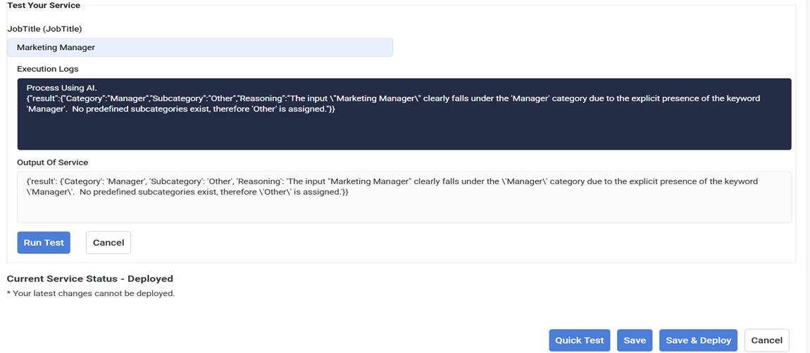 - Quick Test – Click on Quick Test to validate the service and preview the categorized results in real time.