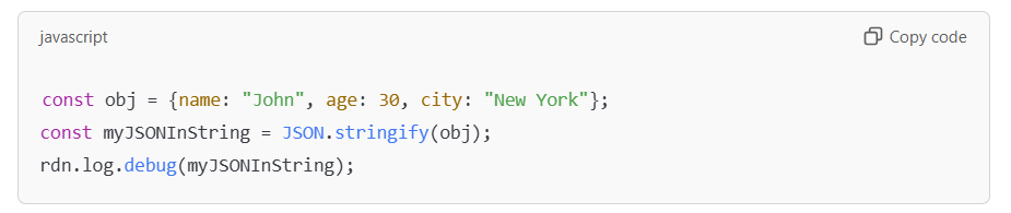 - Log Functions: RDN offers logging capabilities for debugging JavaScript logic. You can utilize the rdn.debug.log() function, which accepts a string as input and displays the string’s value in the Log area. It’s important to emphasize that these logs are exclusively accessible for troubleshooting and testing during the development of Custom Service.