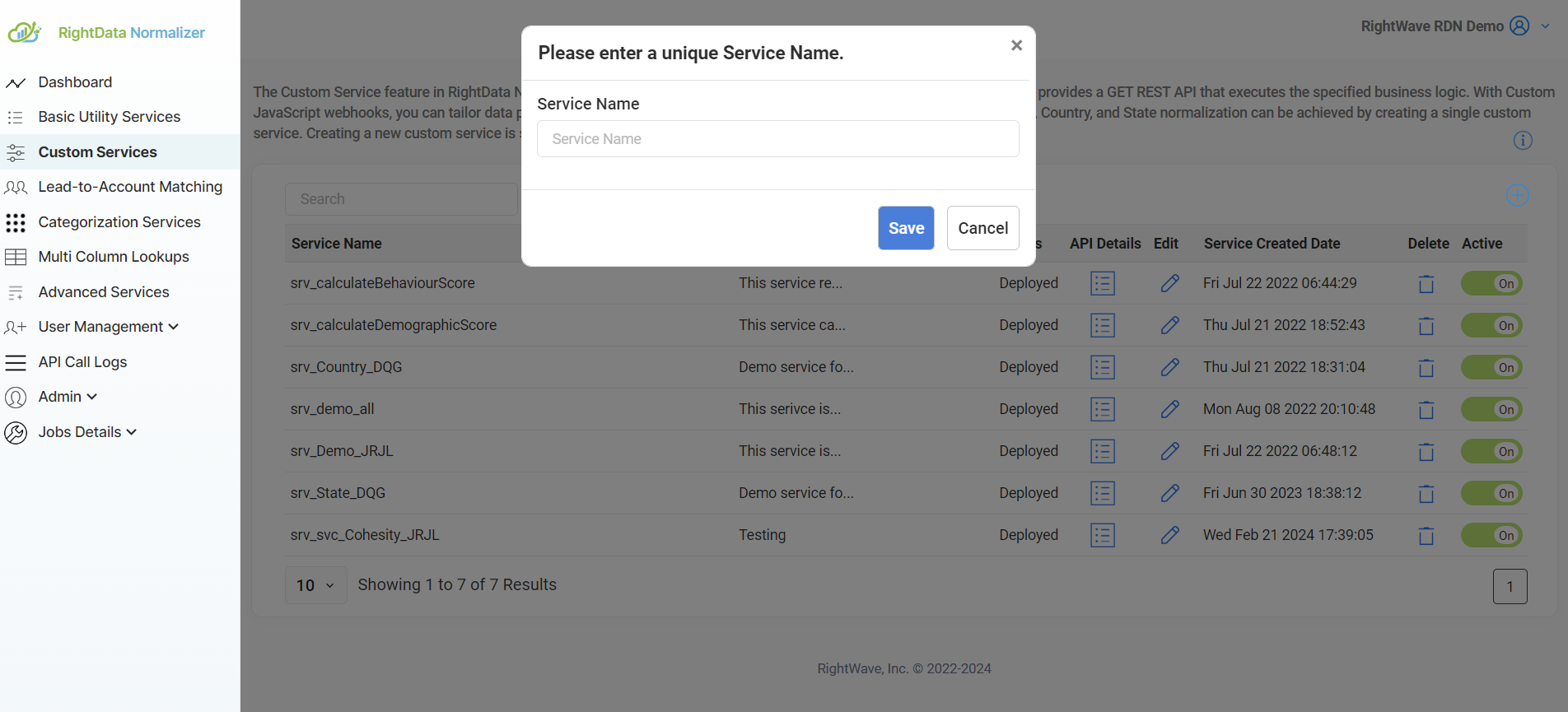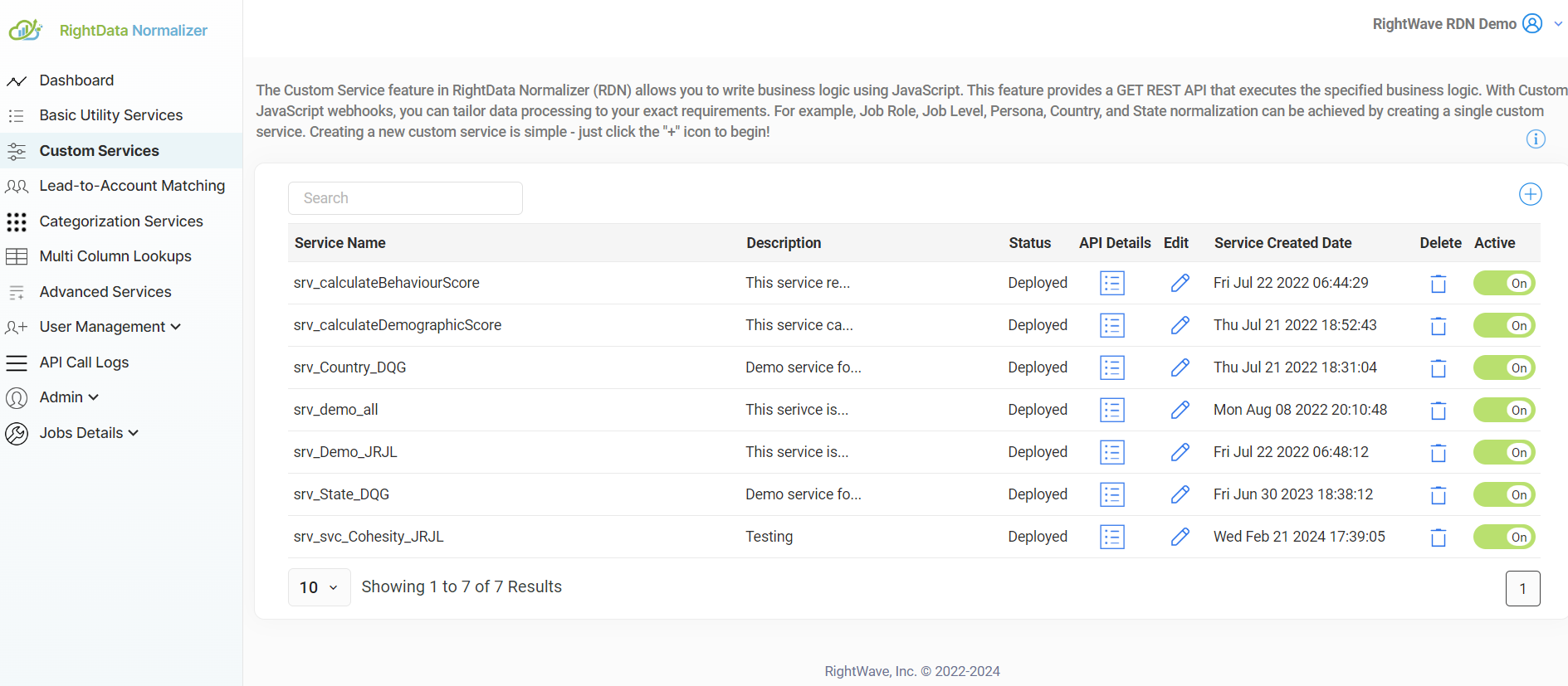 RDN provides a set of standard functions, referred to as Basic Services, that can be integrated into your custom services. These functions handle common operations that can be reused across various services. More details on each individual Basic Service can be found in the Basic Services Help Section.