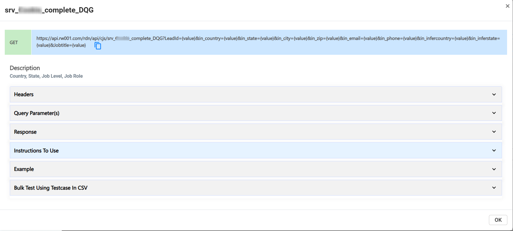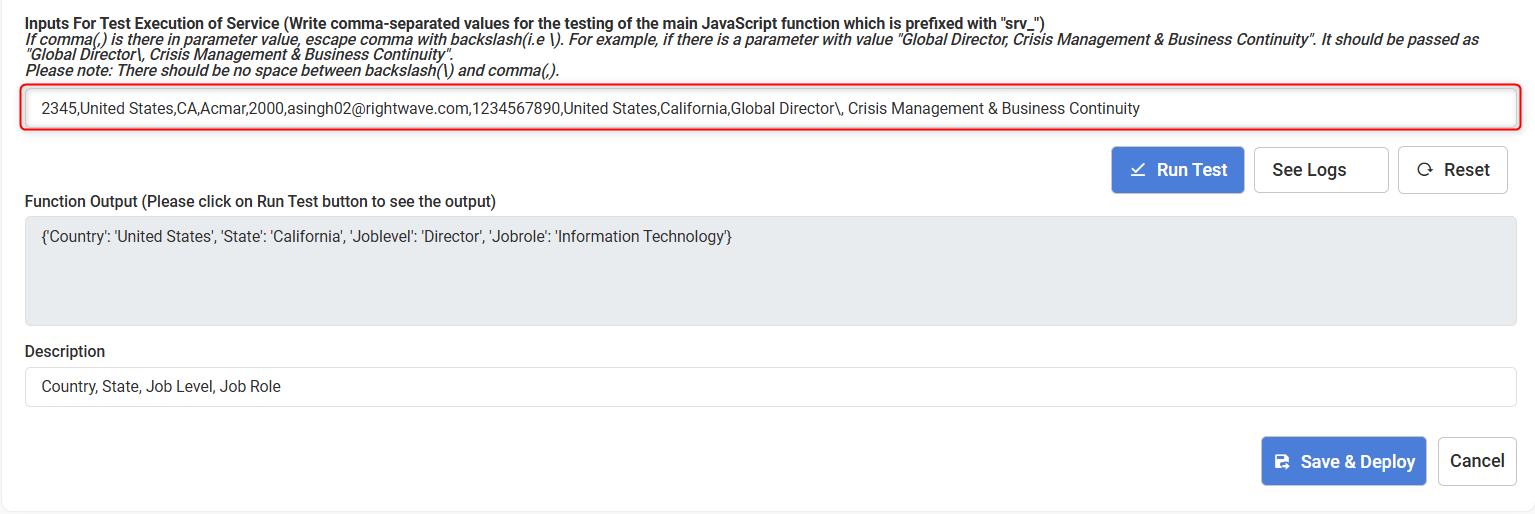 To evaluate the functionality of a custom service, you need to provide the necessary input parameters for testing. These input parameters should be submitted as a comma-separated list. If any parameter value contains a comma, it must be escaped using a backslash (\). For example, a parameter like “Global Director, Crisis Management & Business Continuity” should be written as “Global Director\, Crisis Management & Business Continuity”, ensuring there is no space between the backslash and the comma.