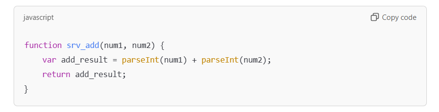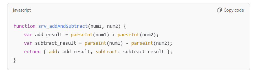 If the function srv_addAndSubtract(num1, num2) is called with the arguments 3 and 2, the returned output will be: