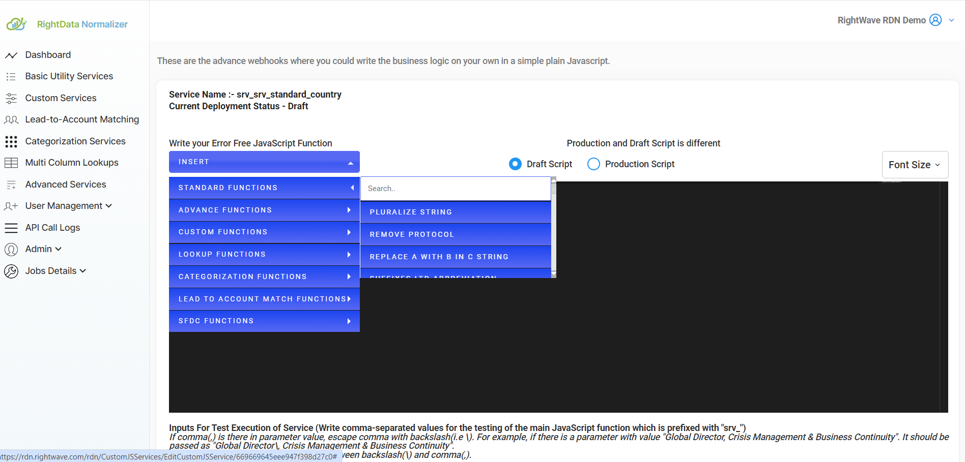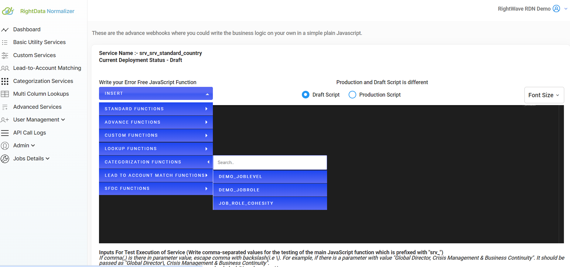 These functions are available in RDN as REST services and can be used directly within your custom service logic. Service functions cover a range of common use cases, including basic operations, data lookups, categorization, and lead-to-account matching. You can find these functions via the INSERT Widget in the JS editor, which helps you insert the function calling code at the cursor position, along with an output template in comments that you can delete later.