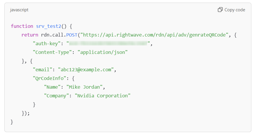 return rdn.call.POST(“https://api.rightwave.com/rdn/api/adv/genrateQRCode”, {