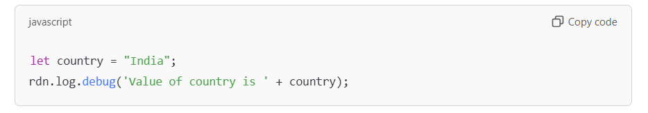 rdn.log.debug(‘Value of country is ‘ + country);
