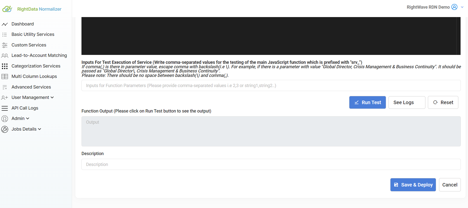 Please note that deploying the script to production is contingent on passing all test cases. When attempting to deploy a custom service, the system will automatically run the test cases, and the service will only be deployed if all tests are successful.